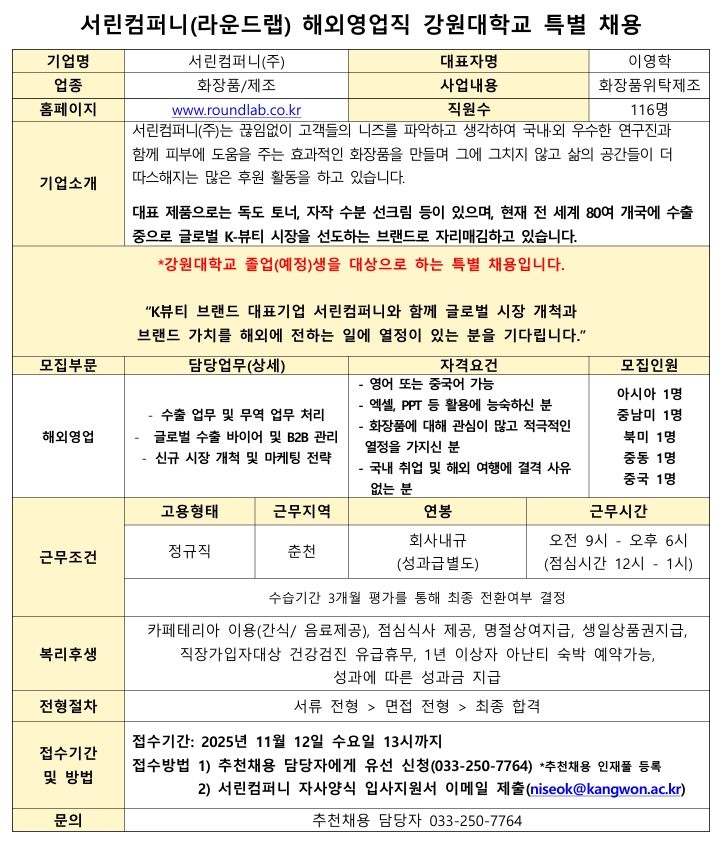 뷰티산업 및 해외영업직에 관심이 있는 미취업 졸업생 및 졸업 예정 학생에게 안내하여 주시기 바랍니다.